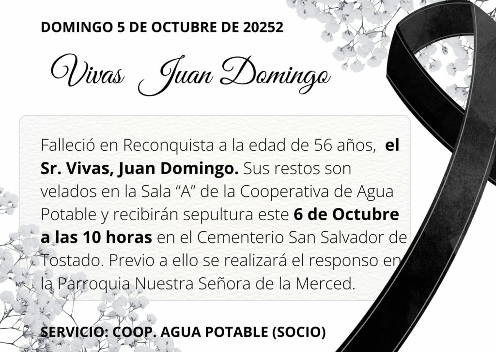 Falleció en Reconquista a la edad de 56 años, el Sr. Vivas, Juan Domingo. Sus restos son velados en la Sala “A” de la Cooperativa de Agua Potable y recibirán sepultura este 6 de Octubre a las 10 horas en el Cementerio San Salvador de Tostado. Previo a ello se realizará el responso en la Parroquia Nuestra Señora de la Merced.