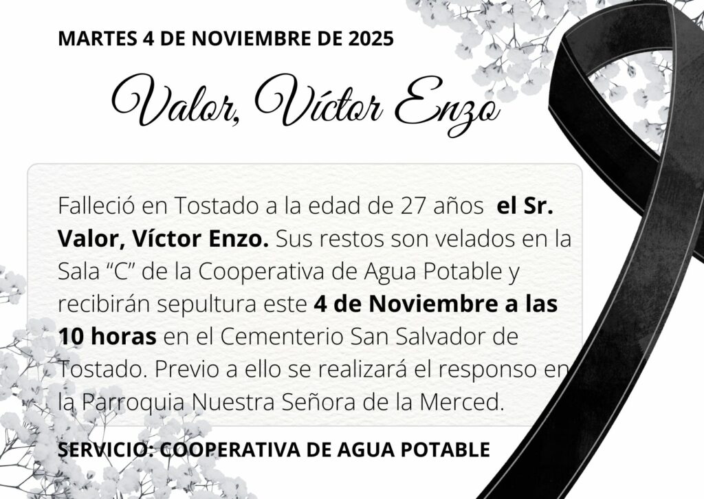 Falleció en Tostado a la edad de 27 años el Sr. Valor, Víctor Enzo. Sus restos son velados en la Sala “C” de la Cooperativa de Agua Potable y recibirán sepultura este 4 de Noviembre a las 10 horas en el Cementerio San Salvador de Tostado. Previo a ello se realizará el responso en la Parroquia Nuestra Señora de la Merced.