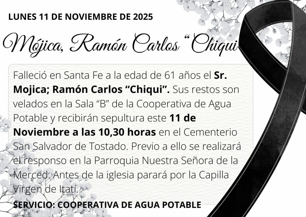 Falleció en Santa Fe a la edad de 61 años el Sr. Mojica; Ramón Carlos “Chiqui”. Sus restos son velados en la Sala “B” de la Cooperativa de Agua Potable y recibirán sepultura este 11 de Noviembre a las 10,30 horas en el Cementerio San Salvador de Tostado. Previo a ello se realizará el responso en la Parroquia Nuestra Señora de la Merced. Antes de la iglesia parará por la Capilla Virgen de Itatí.