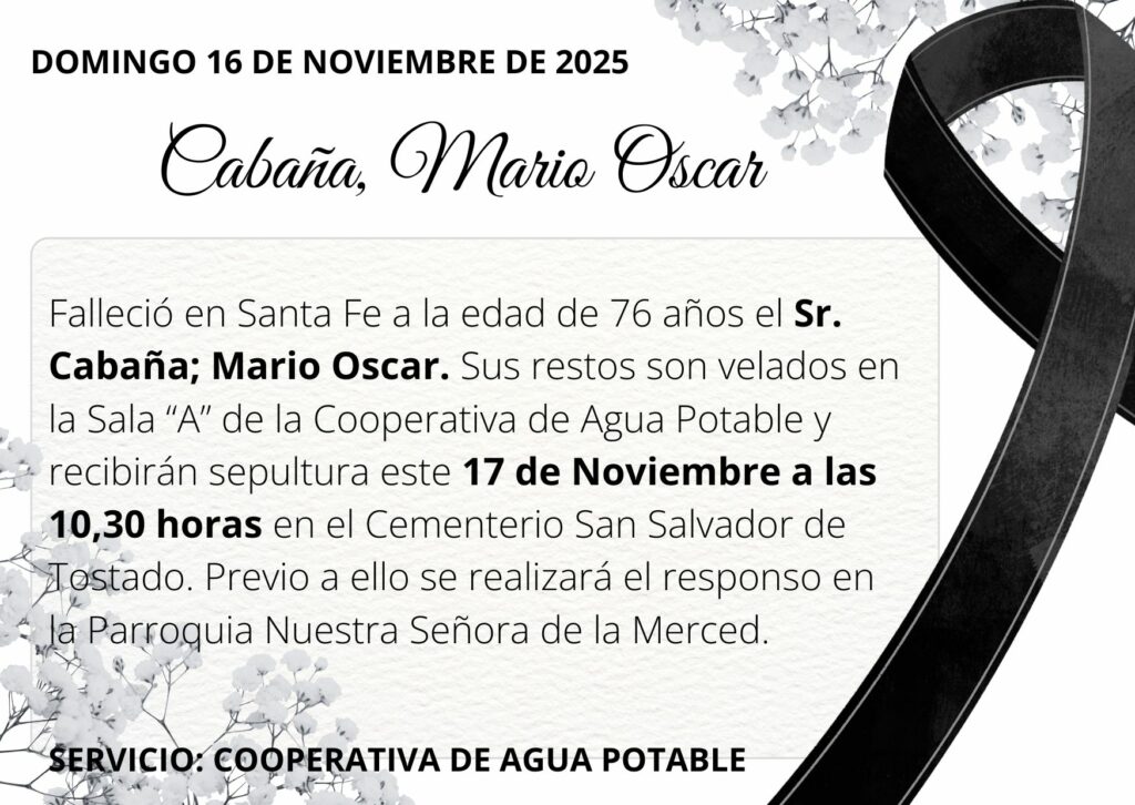 Falleció en Santa Fe a la edad de 76 años el Sr. Cabaña; Mario Oscar. Sus restos son velados en la Sala “A” de la Cooperativa de Agua Potable y recibirán sepultura este 17 de Noviembre a las 10,30 horas en el Cementerio San Salvador de Tostado. Previo a ello se realizará el responso en la Parroquia Nuestra Señora de la Merced.