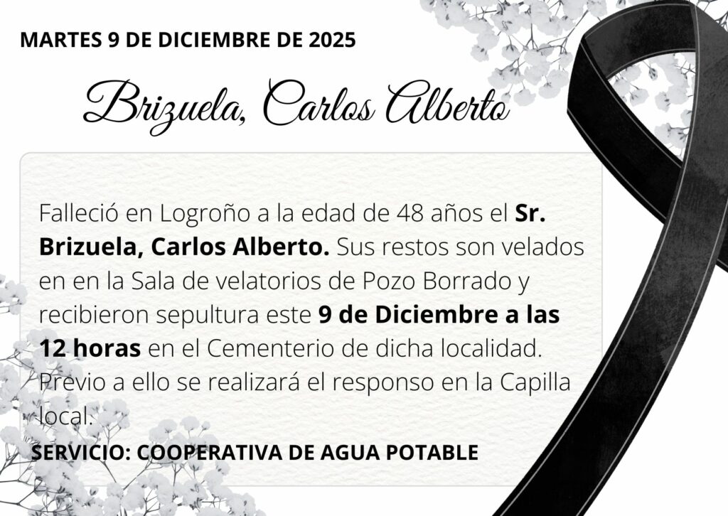 Falleció en Logroño a la edad de 48 años el Sr. Brizuela, Carlos Alberto. Sus restos son velados en en la Sala de velatorios de Pozo Borrado y recibieron sepultura este 9 de Diciembre a las 12 horas en el Cementerio de dicha localidad. Previo a ello se realizará el responso en la Capilla local.