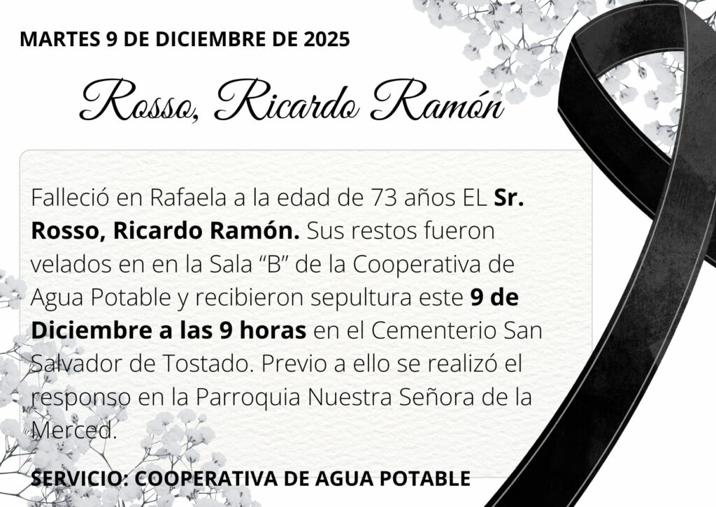 Falleció en Rafaela a la edad de 73 años EL Sr. Rosso, Ricardo Ramón. Sus restos fueron velados en en la Sala “B” de la Cooperativa de Agua Potable y recibieron sepultura este 9 de Diciembre a las 9 horas en el Cementerio San Salvador de Tostado. Previo a ello se realizó el responso en la Parroquia Nuestra Señora de la Merced.
