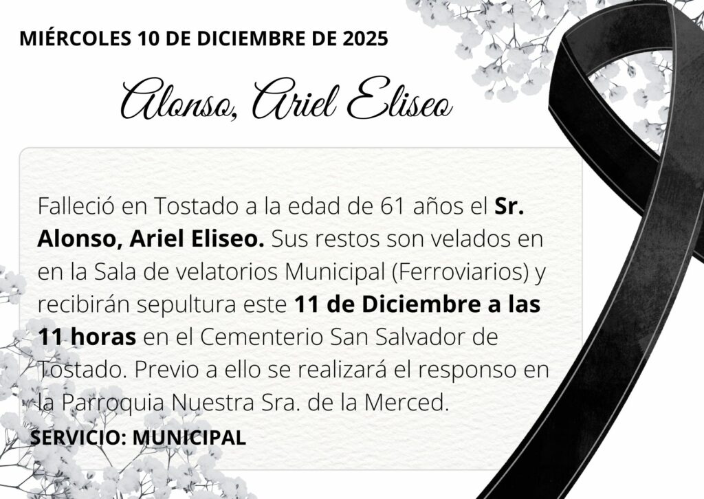 Falleció en Tostado a la edad de 61 años el Sr. Alonso, Ariel Eliseo. Sus restos son velados en en la Sala de velatorios Municipal (Ferroviarios) y recibirán sepultura este 11 de Diciembre a las 11 horas en el Cementerio San Salvador de Tostado. Previo a ello se realizará el responso en la Parroquia Nuestra Sra. de la Merced.