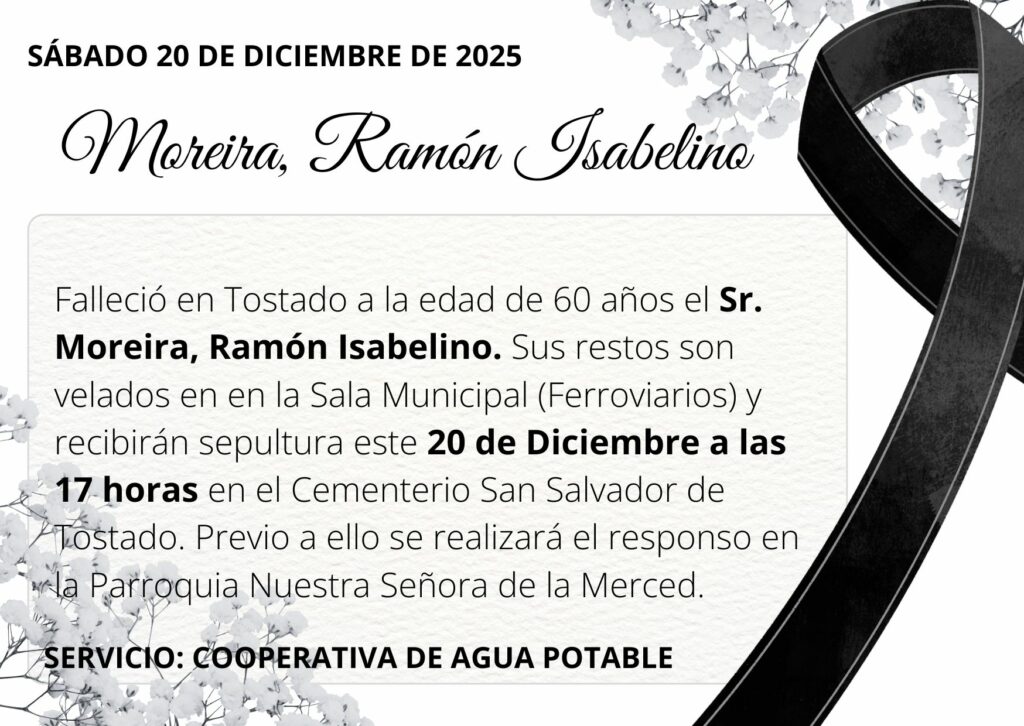 Falleció en Tostado a la edad de 60 años el Sr. Moreira, Ramón Isabelino. Sus restos son velados en en la Sala Municipal (Ferroviarios) y recibirán sepultura este 20 de Diciembre a las 17 horas en el Cementerio San Salvador de Tostado. Previo a ello se realizará el responso en la Parroquia Nuestra Señora de la Merced.