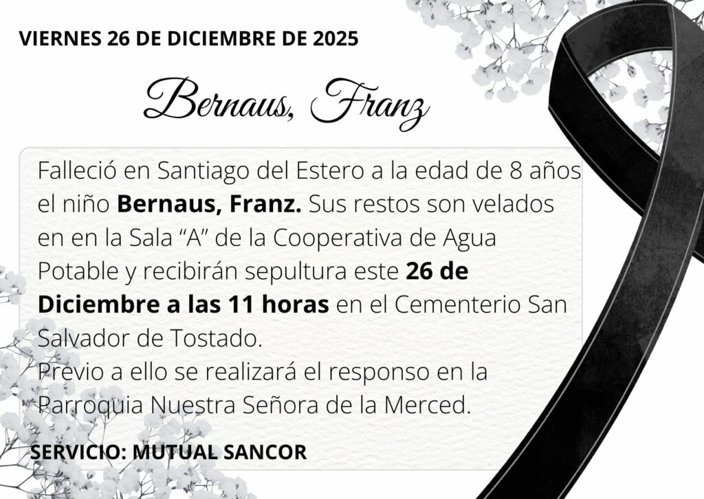 alleció en Santiago del Estero a la edad de 8 años el niño Bernaus, Franz. Sus restos son velados en en la Sala “A” de la Cooperativa de Agua Potable y recibirán sepultura este 26 de Diciembre a las 11 horas en el Cementerio San Salvador de Tostado.