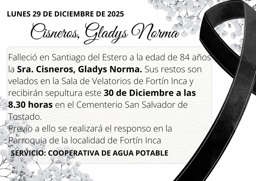 Falleció en Santiago del Estero a la edad de 84 años la Sra. Cisneros, Gladys Norma. Sus restos son velados en la Sala de Velatorios de Fortín Inca y recibirán sepultura este 30 de Diciembre a las 8.30 horas en el Cementerio San Salvador de Tostado.