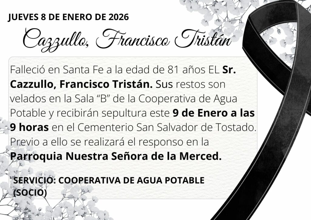 Falleció en Santa Fe a la edad de 81 años EL Sr. Cazzullo, Francisco Tristán. Sus restos son velados en la Sala “B” de la Cooperativa de Agua Potable y recibirán sepultura este 9 de Enero a las 9 horas en el Cementerio San Salvador de Tostado.