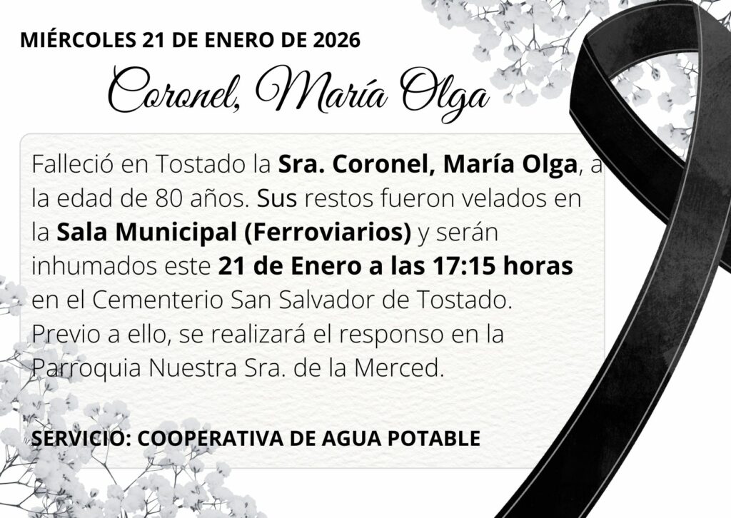 Falleció en Tostado la Sra. Coronel, María Olga, a la edad de 80 años. Sus restos fueron velados en la Sala Municipal (Ferroviarios) y serán inhumados este 21 de Enero a las 17:15 horas en el Cementerio San Salvador de Tostado.